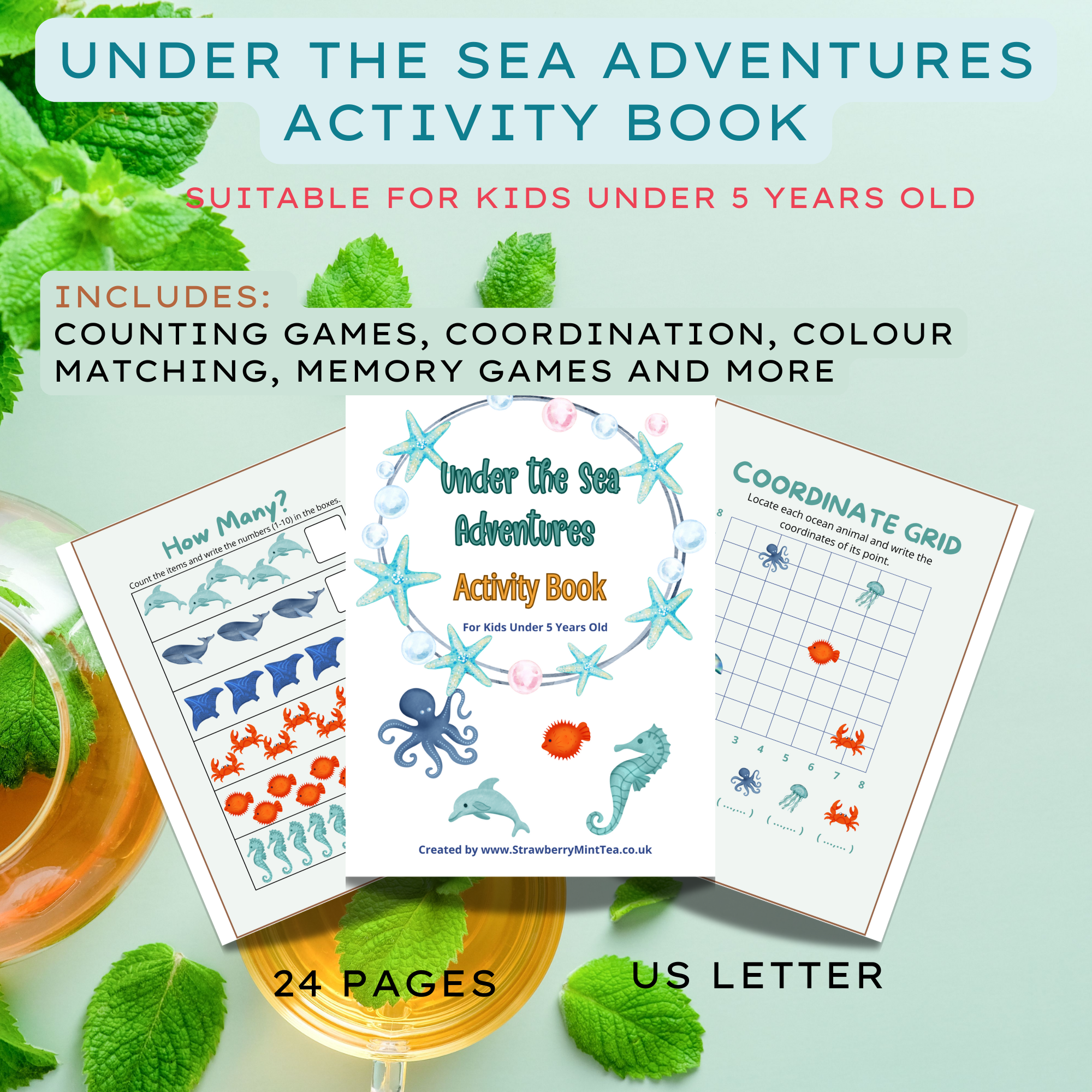 Ocean Animals Activity Book for Kids – Keep little ones engaged and learning with counting games, word searches, writing activities and educational ocean-themed fun. Perfect for travel days or rainy afternoons!