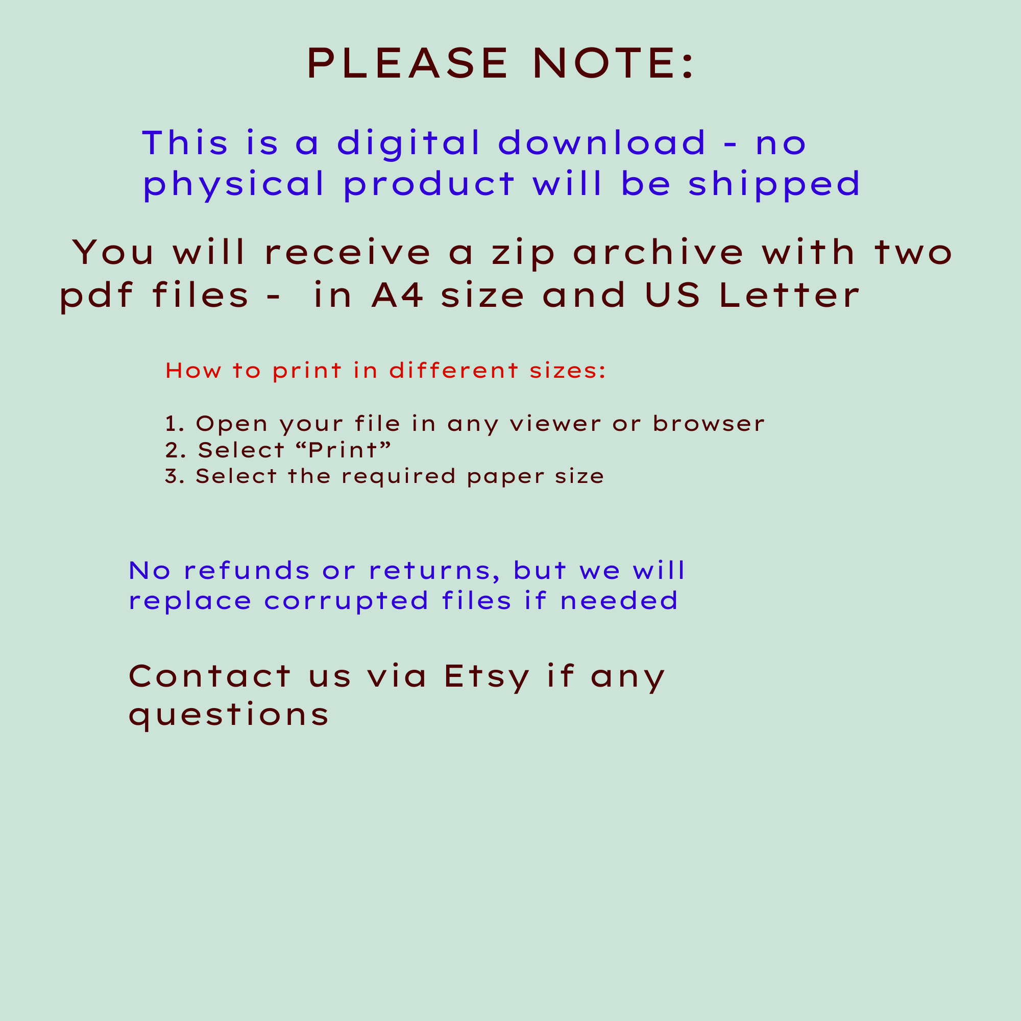 Please note that colors may vary slightly when printed, due to monitor calibration settings, your printout settings and paper type.