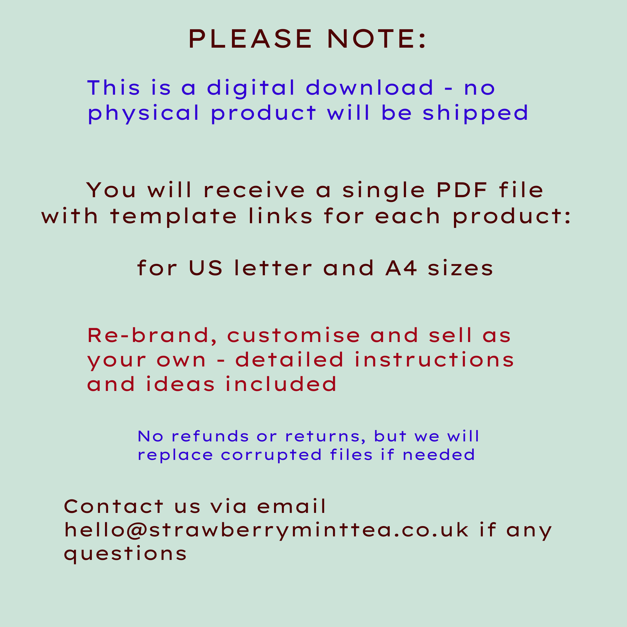 Two PDF files – one with templates links for each PLR product (US Letter and A4), and another – 12 pages Customisation Guide.